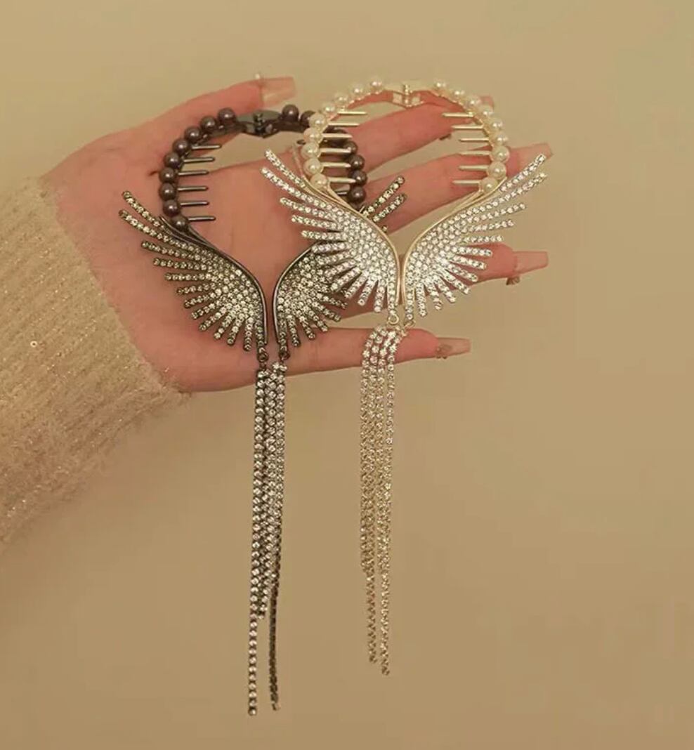 天使の翼/パールラインストーンタッセルピルヘッドポニーテールバックルヘアクリップ