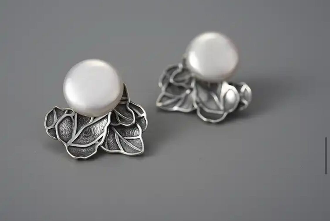 淡水真珠と葉のピアス/ヴィンテージ/デザイナーハンドメイドアクセサリー/スターリングシルバー925