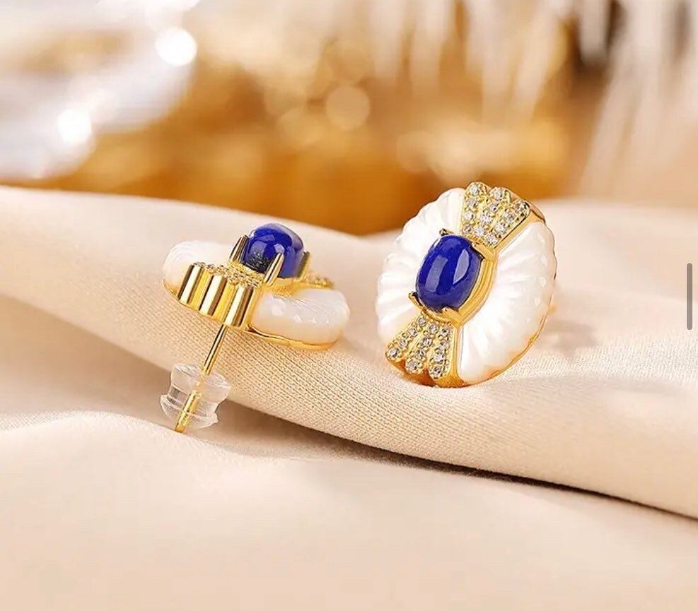 スターリングシルバー925/天然ホワイトシェル/天然石ラピスラズリ/スタッドピアス
