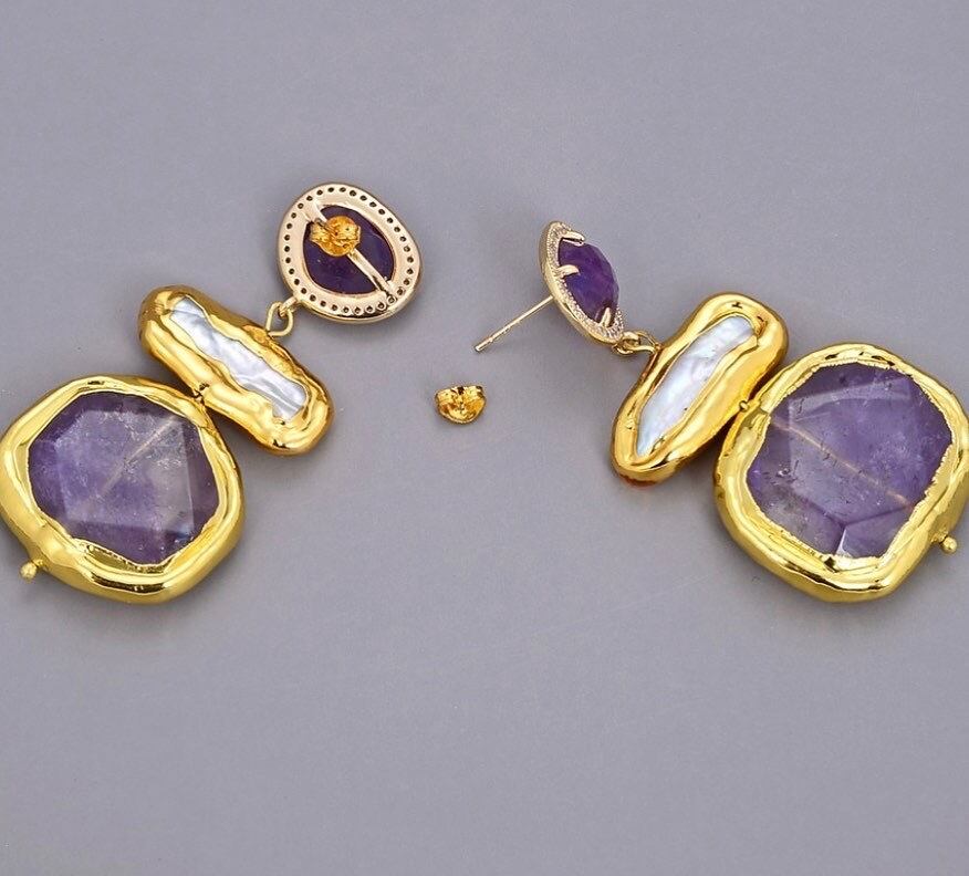 天然ケシパール/天然石アメジストナゲット/天然石アメジストスタッド/チベットシルバー/ステンレススチール